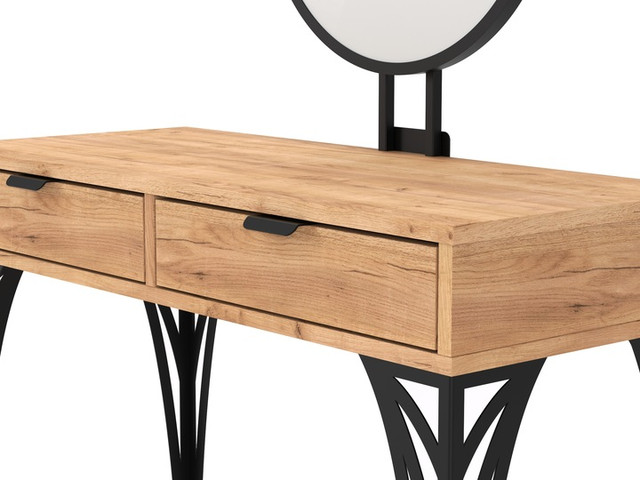 - Поєднання сталі з порошковим покриттям і імітації дерева надає туалетному столику теплий індустріальний характер.