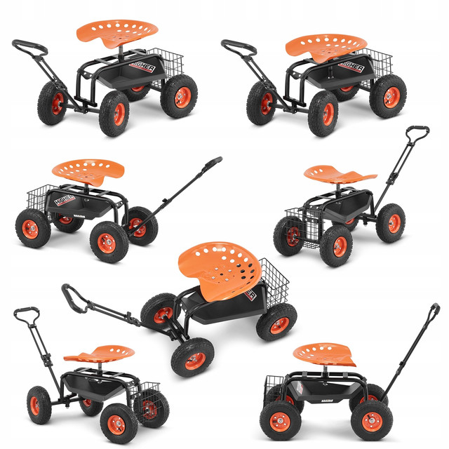 Универсальная и многофункциональная садовая тележка HIGHER с поворотным на 360 градусов сиденьем и регулируемой высотой — идеальное решение для любых работ в саду, огороде или на участке. Коляска была создана для улучшения условий труда и, прежде всего, разгрузки позвоночника и коленей при длительной работе. Конструкция тележки, более подробно описанная ниже, позволяет осуществлять комфортную и эргономичную длительную работу без усталости и перегрузок. Прочная стальная конструкция, рассчитанная на нагрузку до 150 кг, гарантирует безопасность и устойчивость. Прочные материалы, такие как сталь и пластик – гарантируют долгую и безаварийную эксплуатацию. Эта универсальная садовая табуретка может стать прекрасным инструментом для повседневной работы на участке, в саду, огороде или даже в мастерской или гараже.