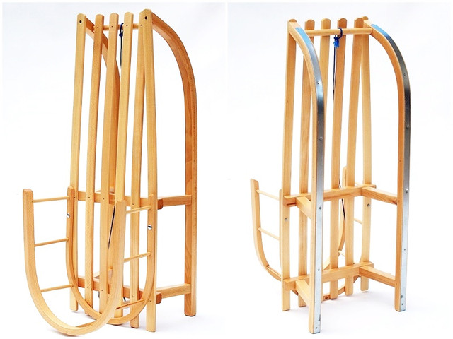 Санки виготовлені з деревини бука. Зверніть увагу, що деревина бука — це тверда деревина, тому вона стійка до пошкоджень. Сани, просочені екологічним лаком, обшиті металевими полозами.